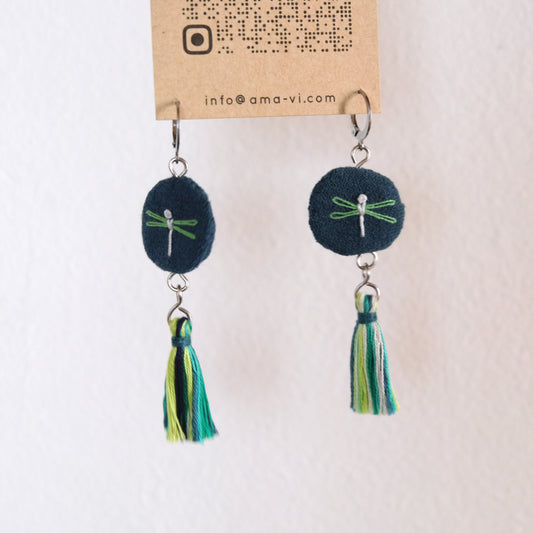 Orecchini sottili con nappa in cotone, malachite e vetro