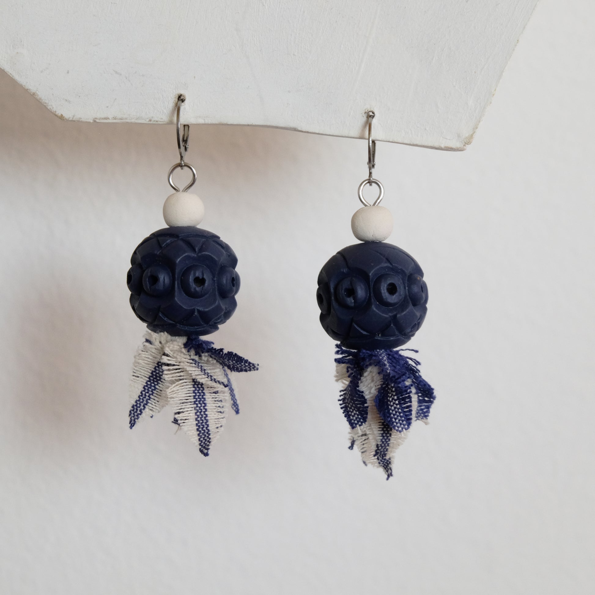 Orecchini realizzati con cotone e legno rivalorizzato, ceramica bianca, acciaio.