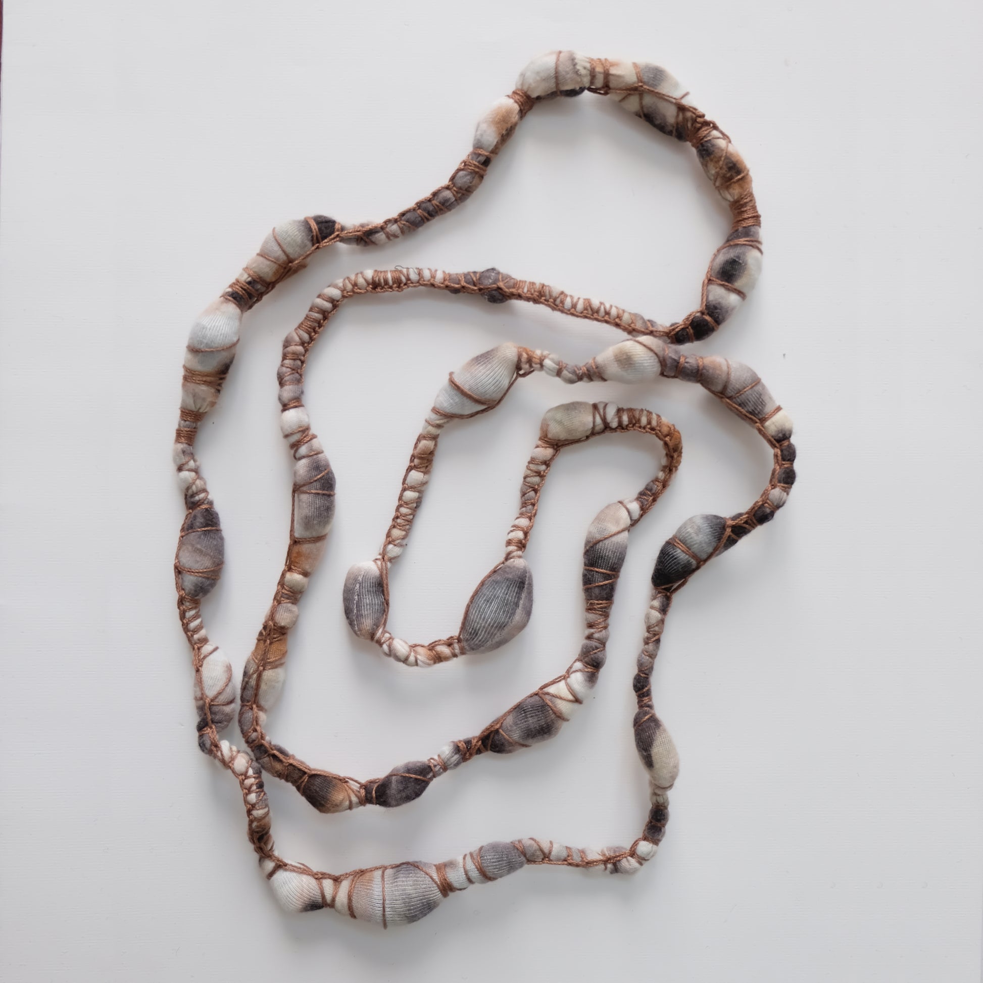 Collana realizzata in viscosa (esterno) e tessuti misti (interno) rivalorizzati.