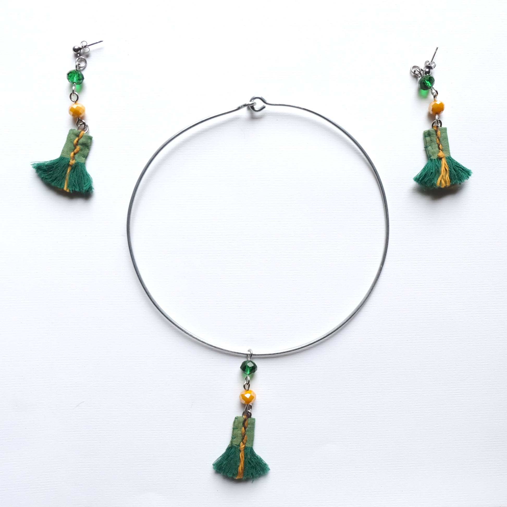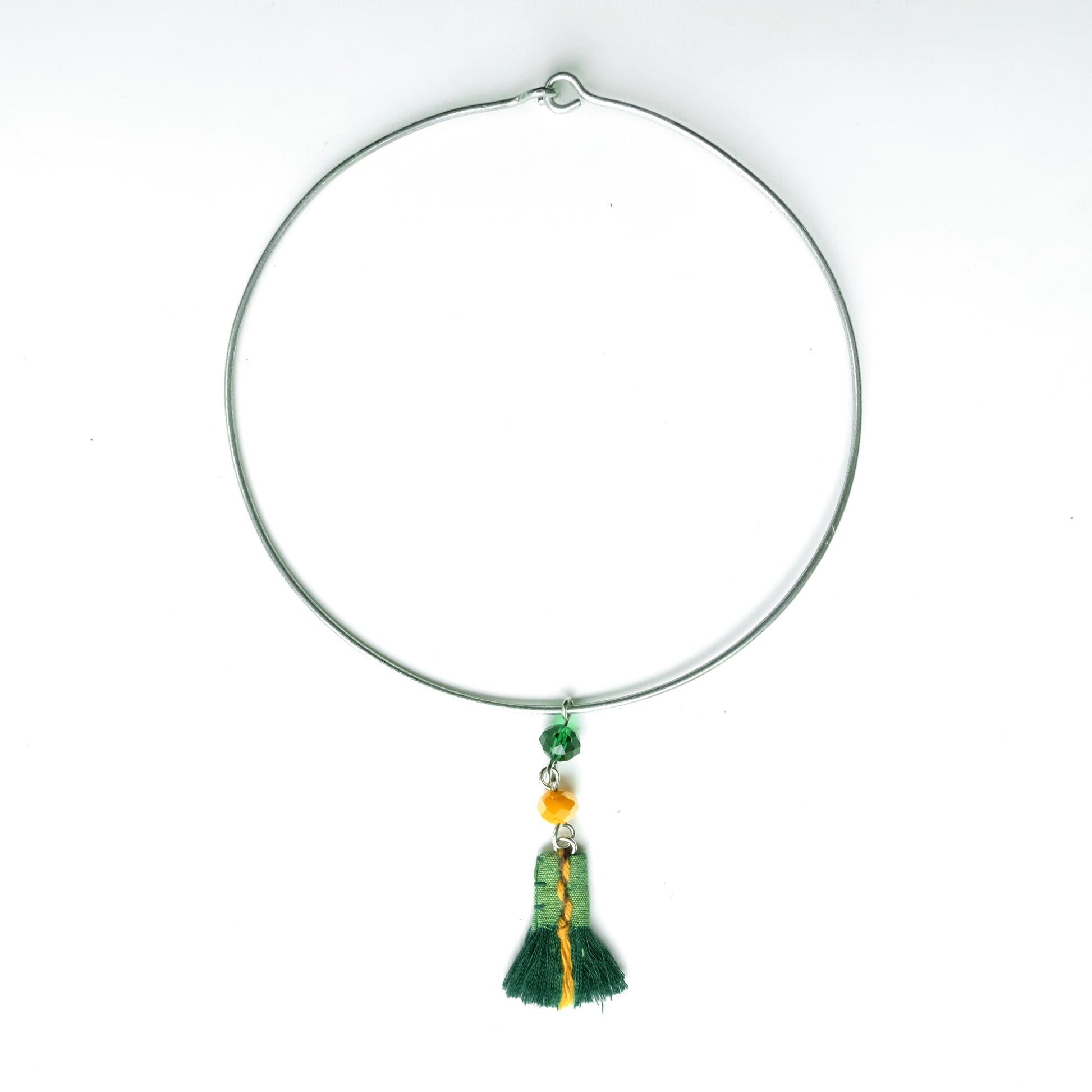 Collana rigida con ciondolo realizzata con cotone rivalorizzato da cascami, vetro e acciaio.