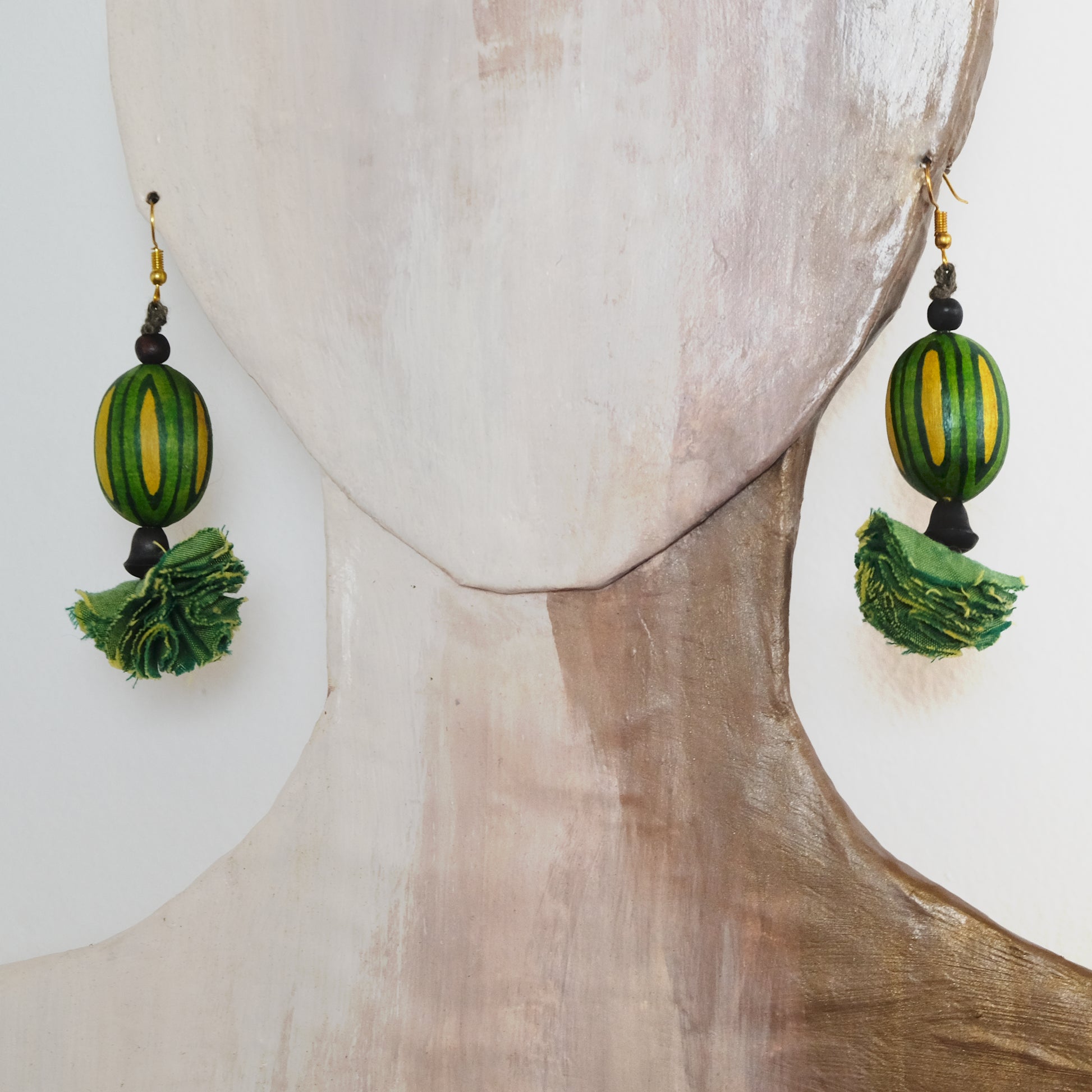 Orecchini realizzati con cotone e legno rivalorizzati, monachella in lega d'ottone.