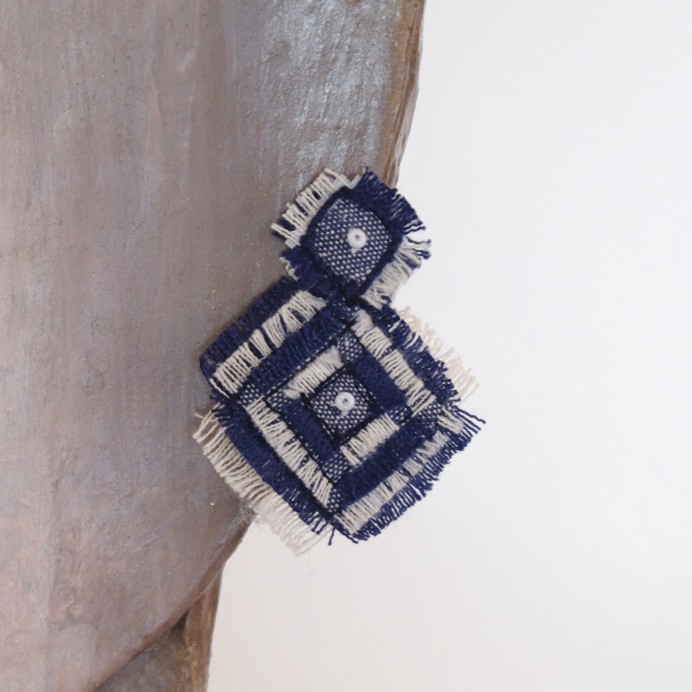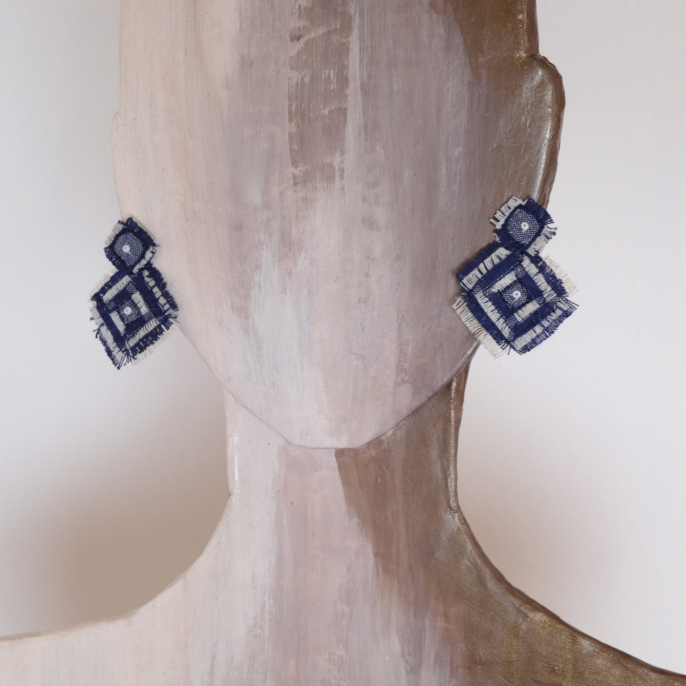 Orecchini realizzati con cotone rivalorizzato, vetro e acciaio.