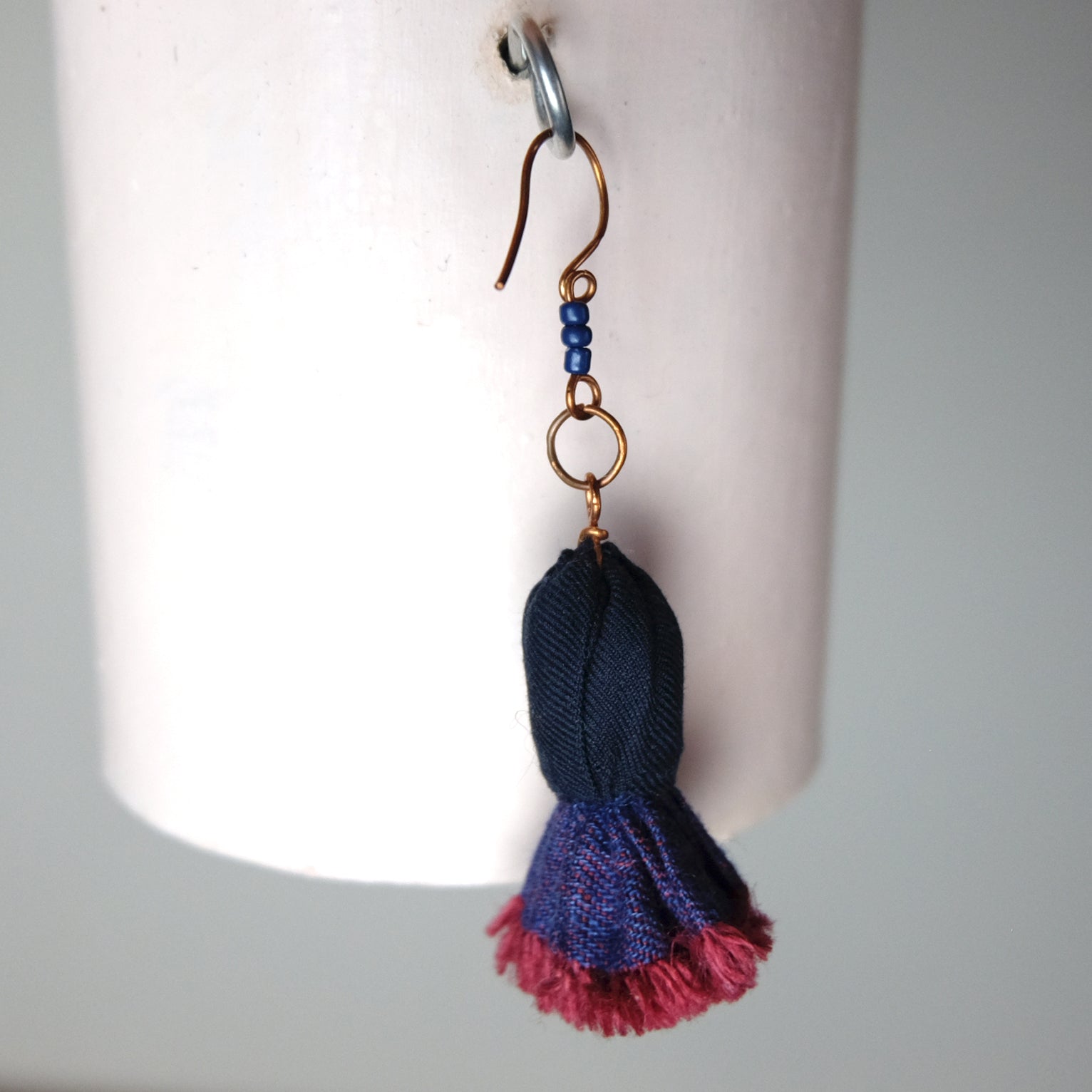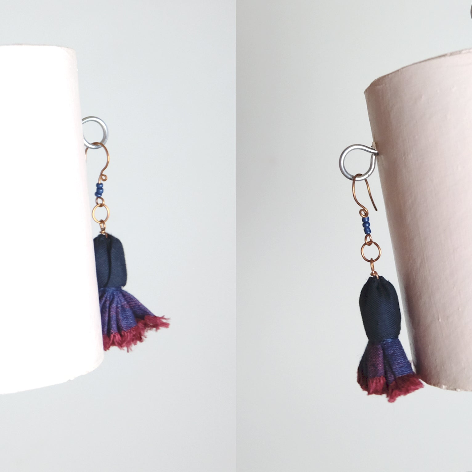 Orecchini realizzati con cotone e lino rivalorizzato, vetro e lega in rame.