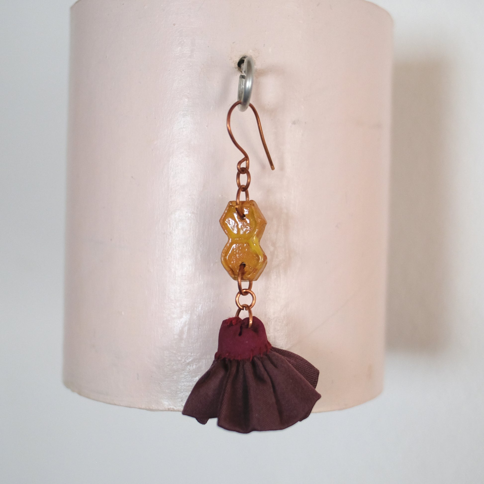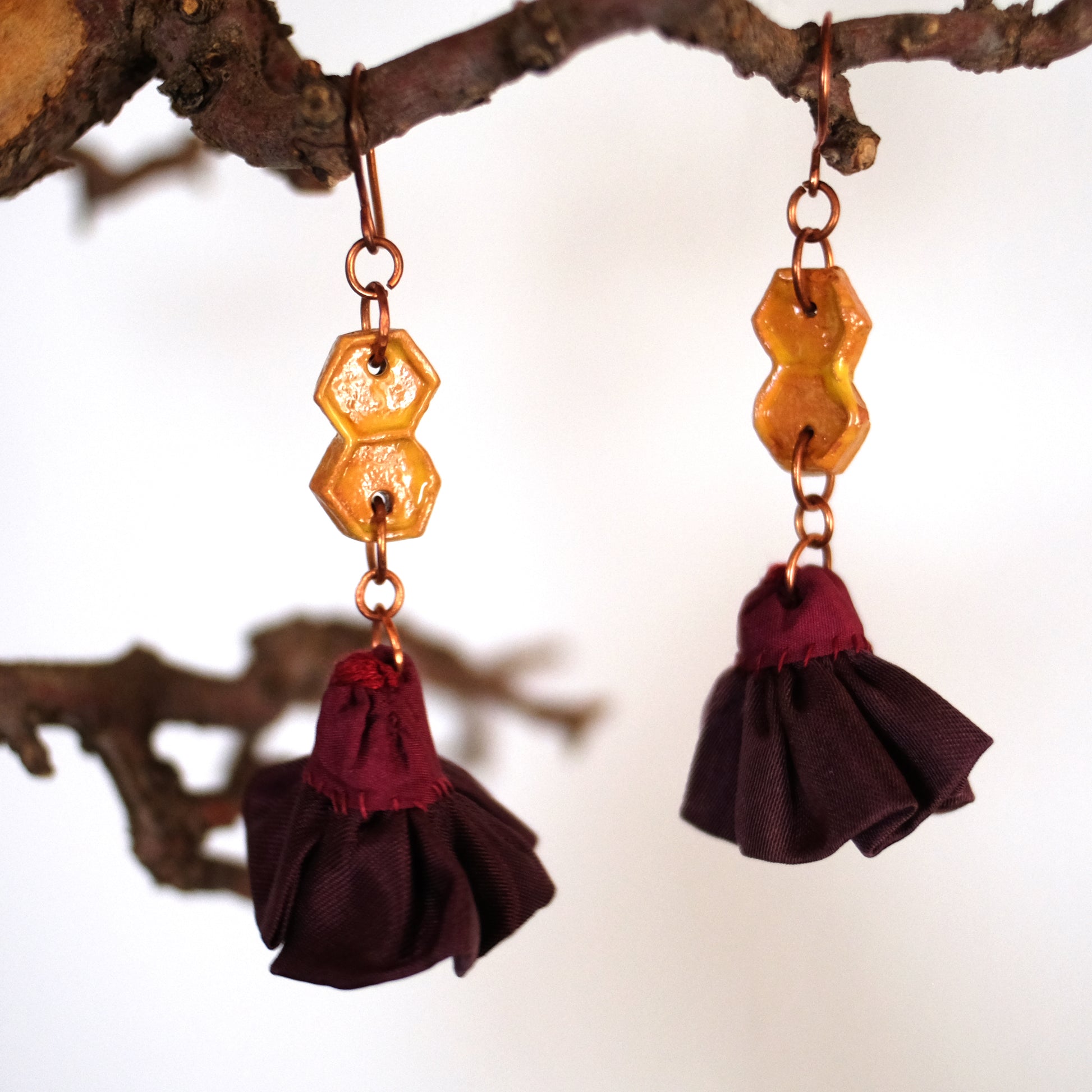 Orecchini realizzati con viscosa rivalorizzate, ceramica smaltata e lega in rame.