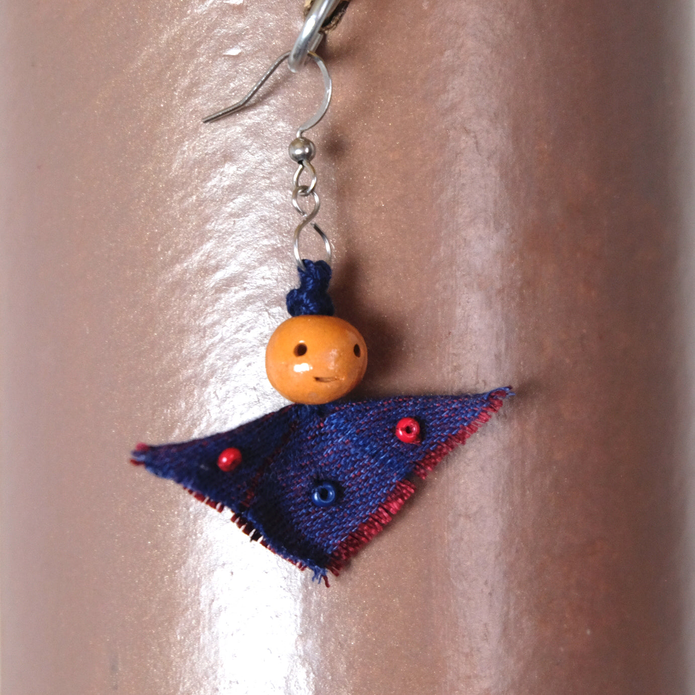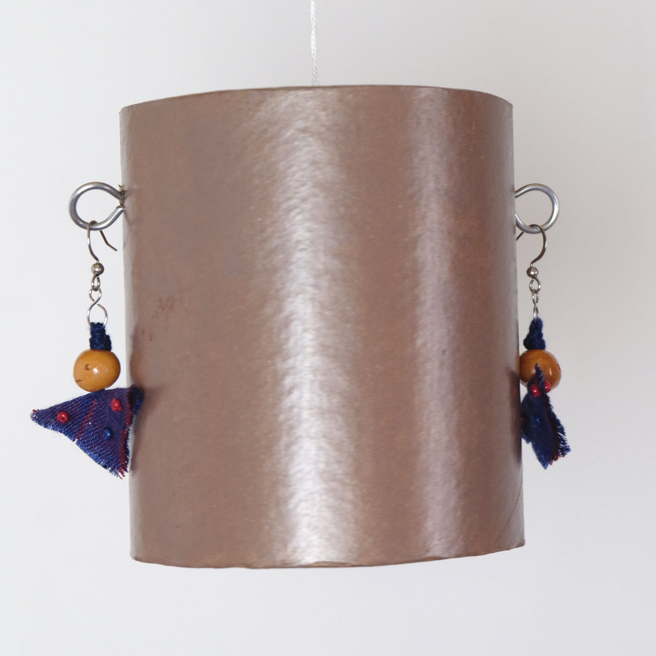 Orecchini realizzati con lino rivalorizzato, ceramica smaltata, vetro e acciaio.