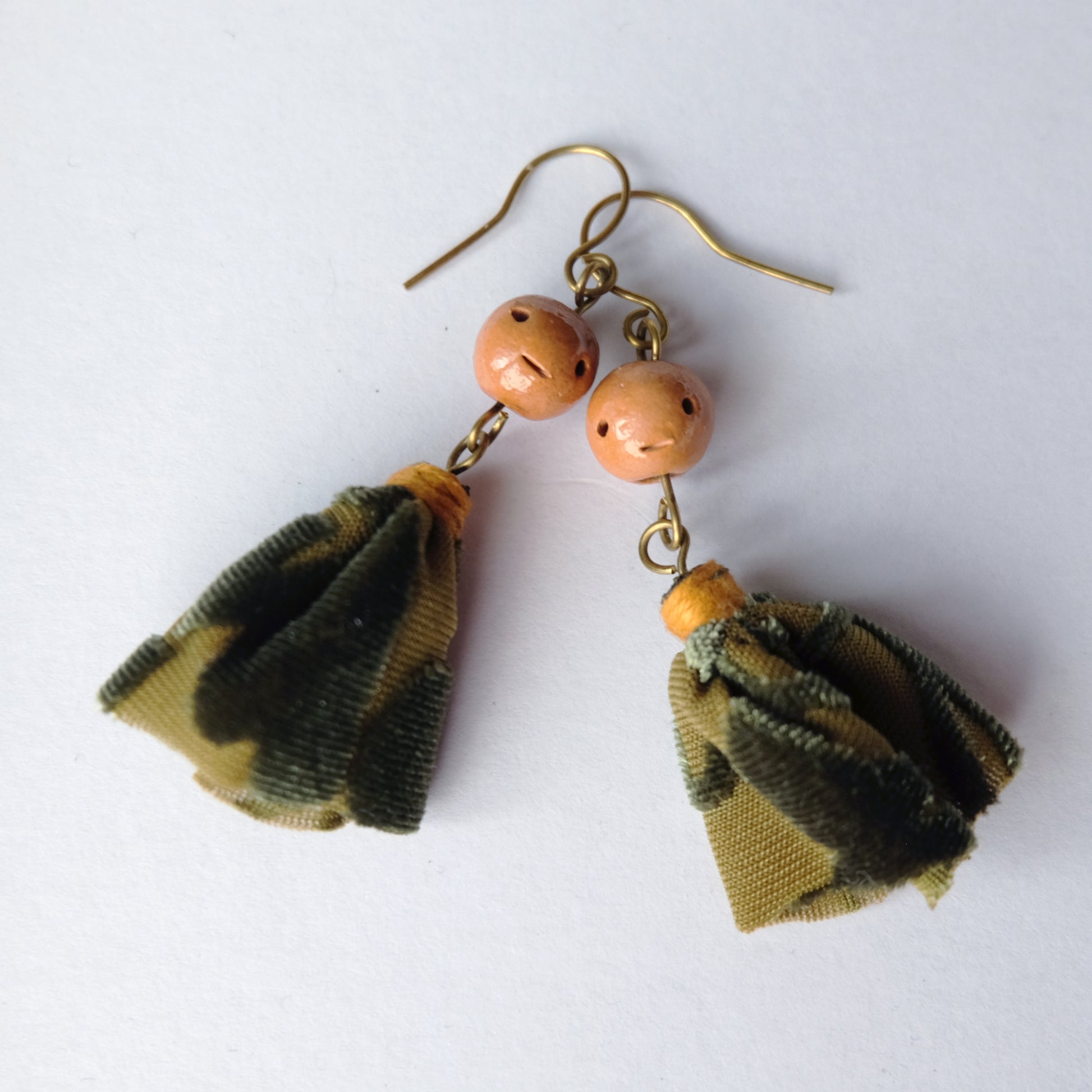 Orecchini pendenti realizzati con poliestere rivalorizzato, ceramica smaltata e lega in ottone.