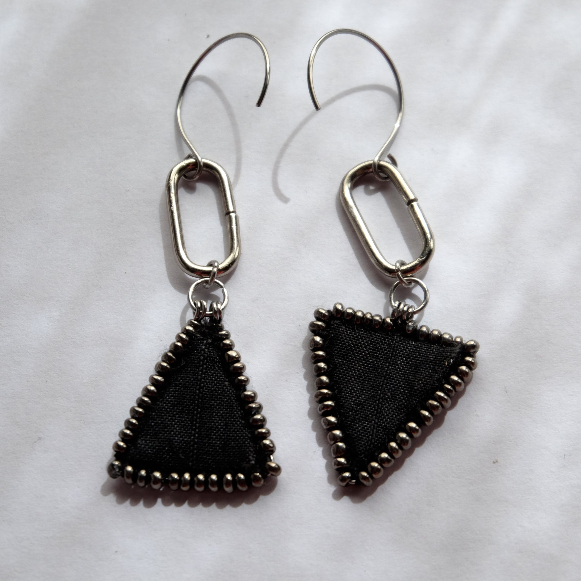 Orecchini realizzati in seta rivalorizzata, acciaio e vetro.