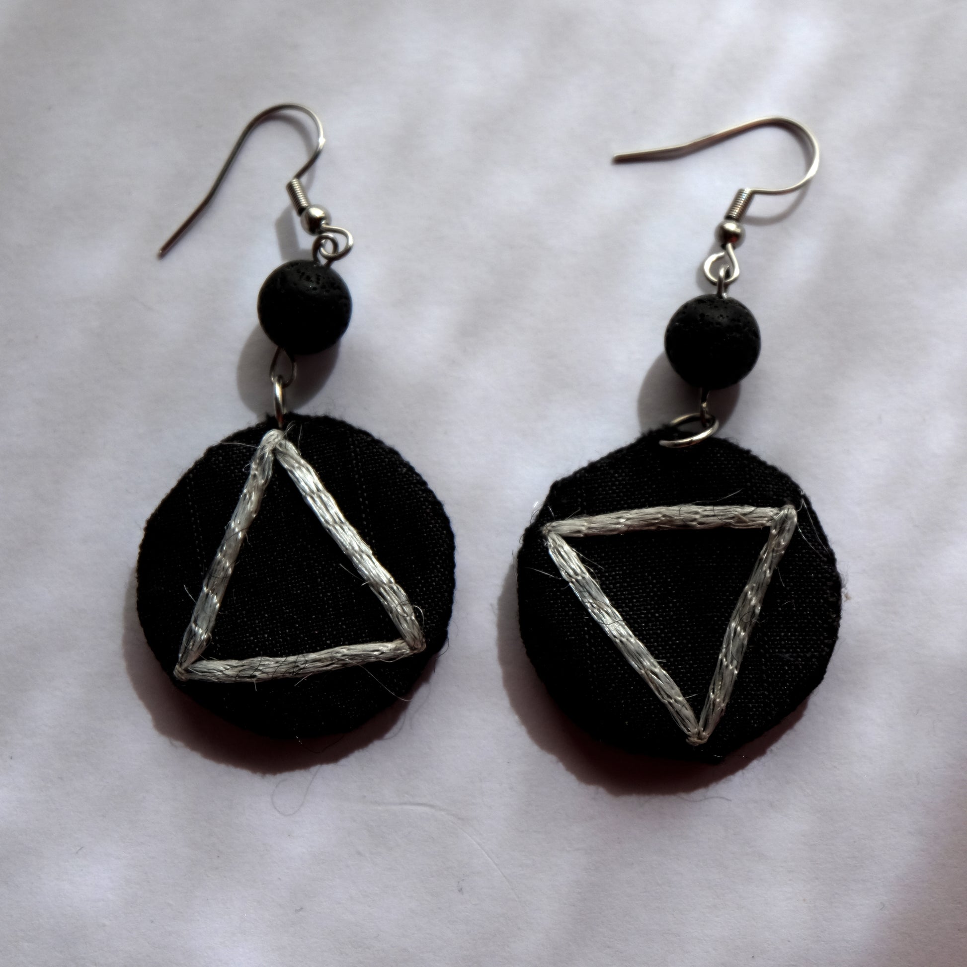 Orecchini realizzati in seta rivalorizzata, pietra vulcanica e acciaio.