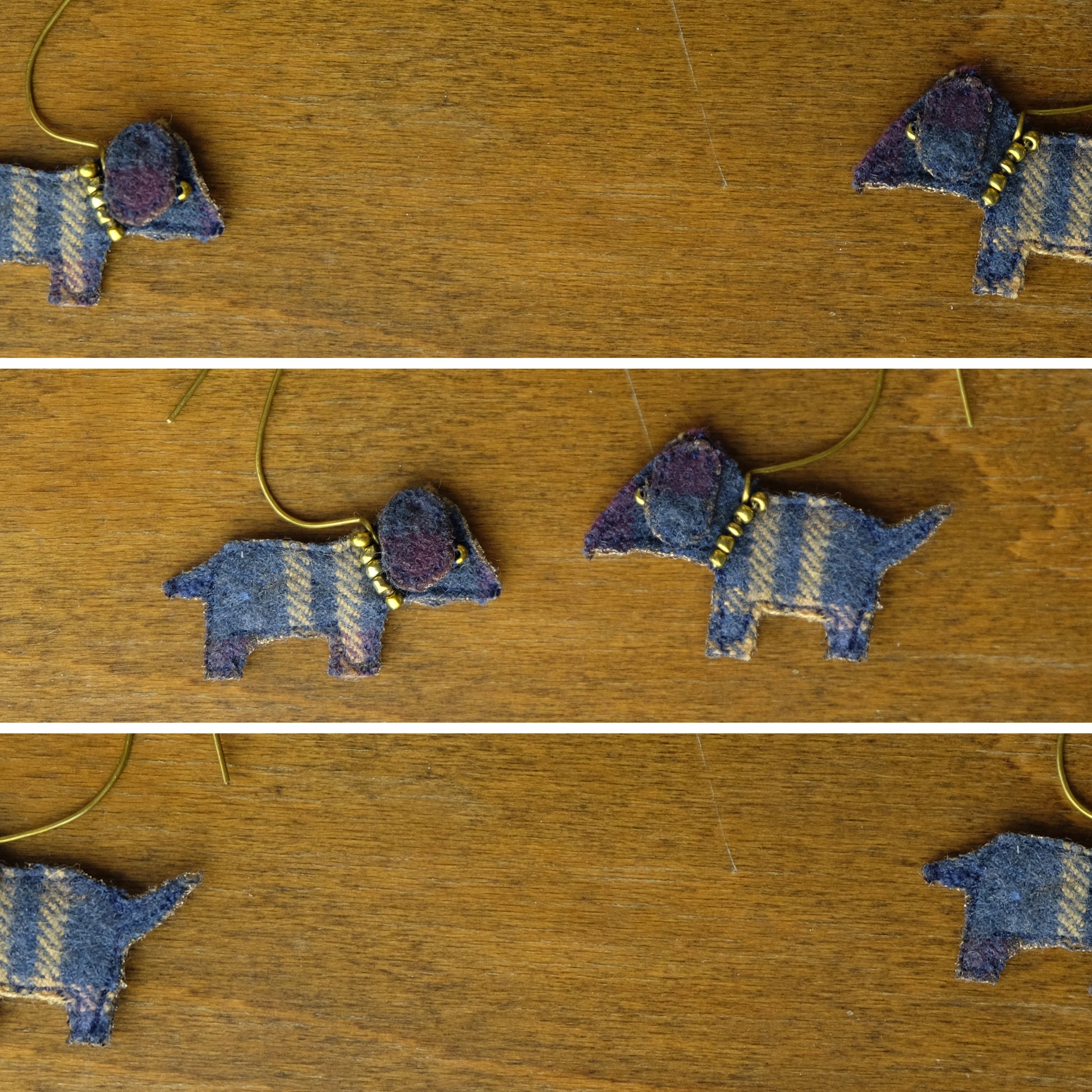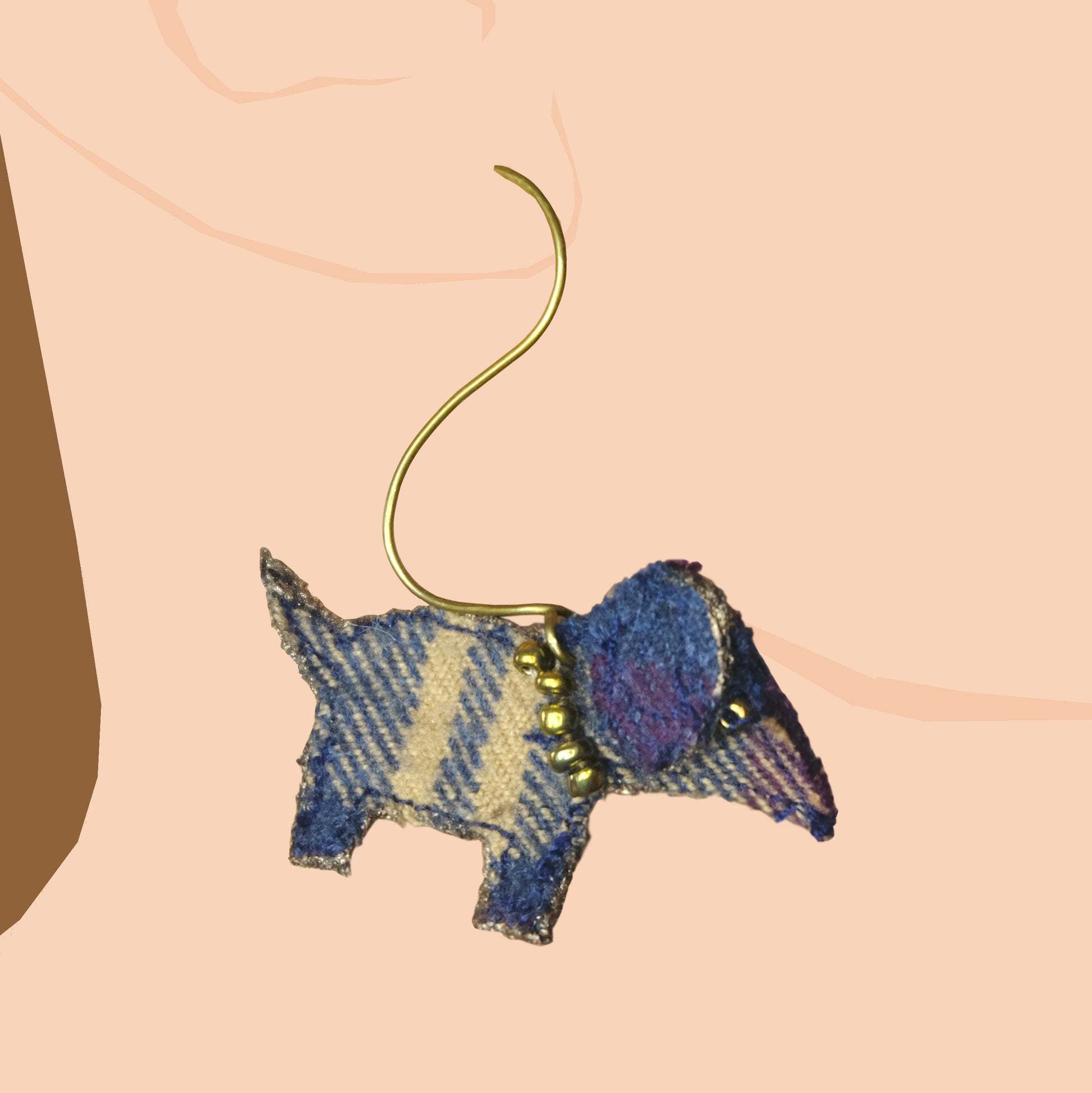 Orecchini realizzati in tessuto rivalorizzato, lega in ottone e vetro.