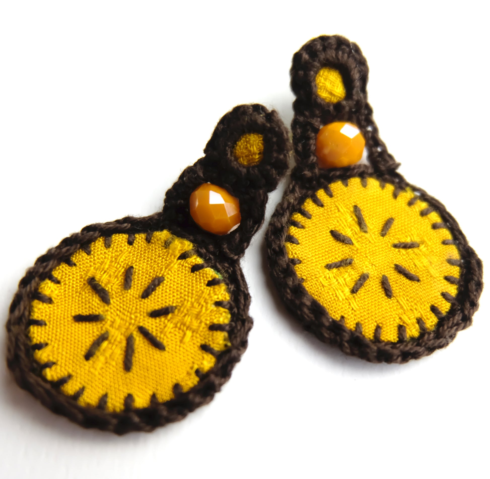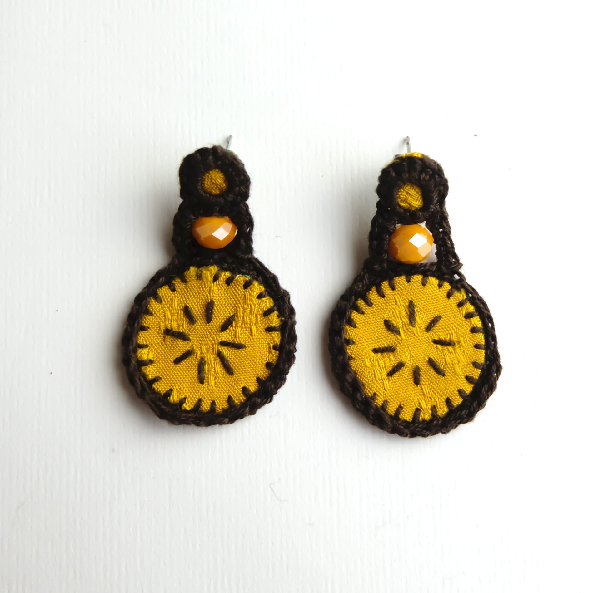Orecchini realizzati con cotone rivalorizzato, vetro, perno in acciaio.