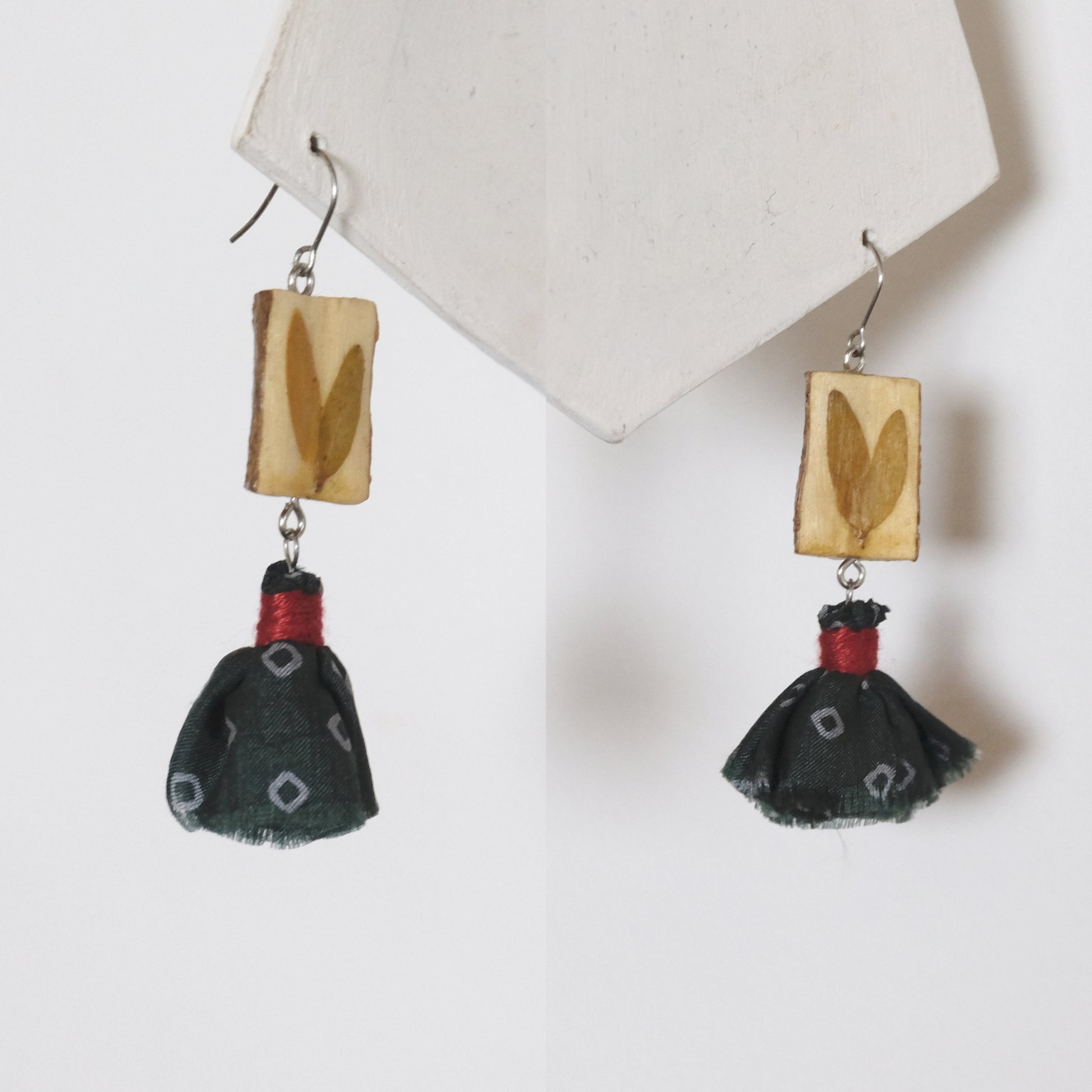 Orecchini pendenti realizzati con tessuto rivalorizzato, legno e acciaio.