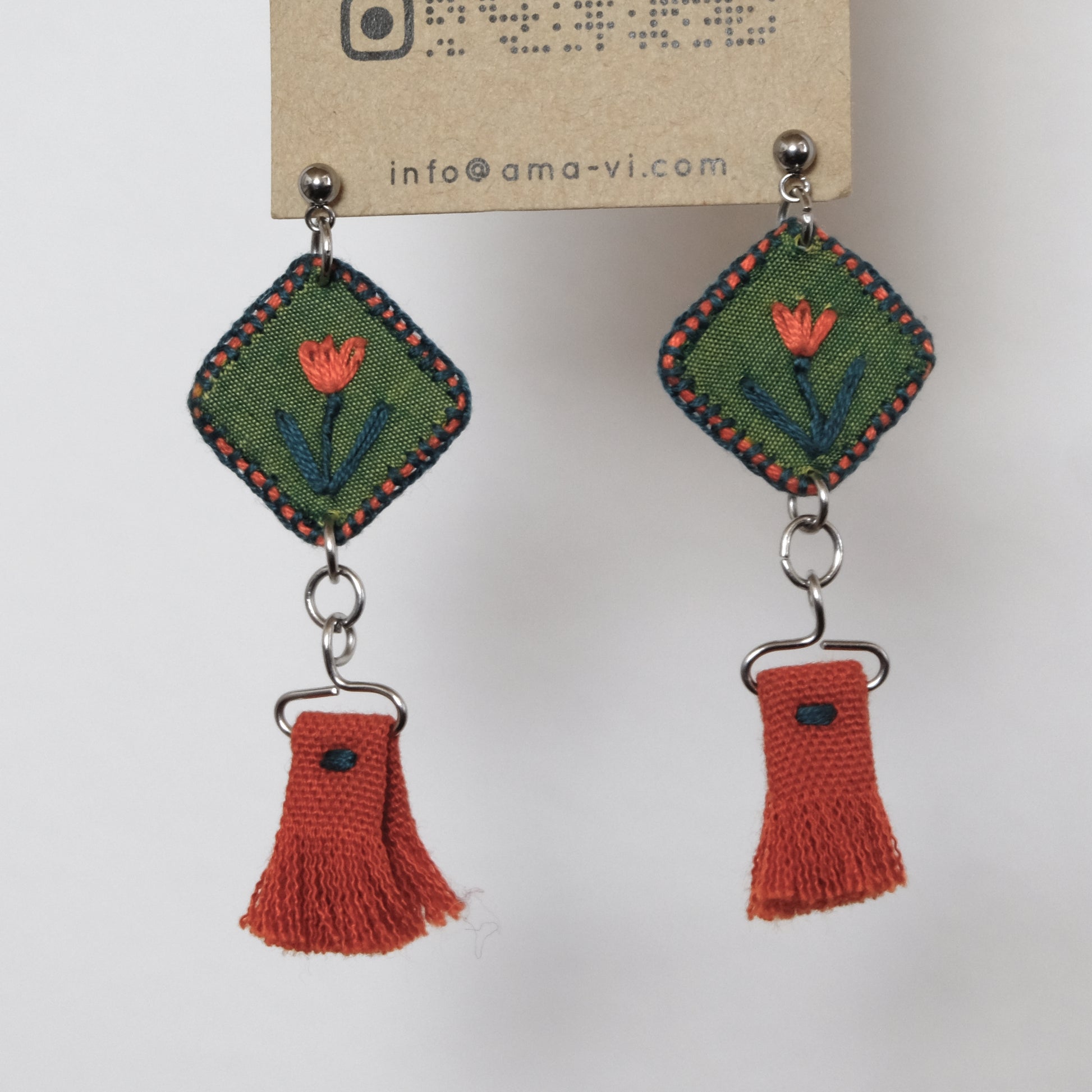Orecchini ricamati realizzati con cotone rivalorizzato e acciaio.