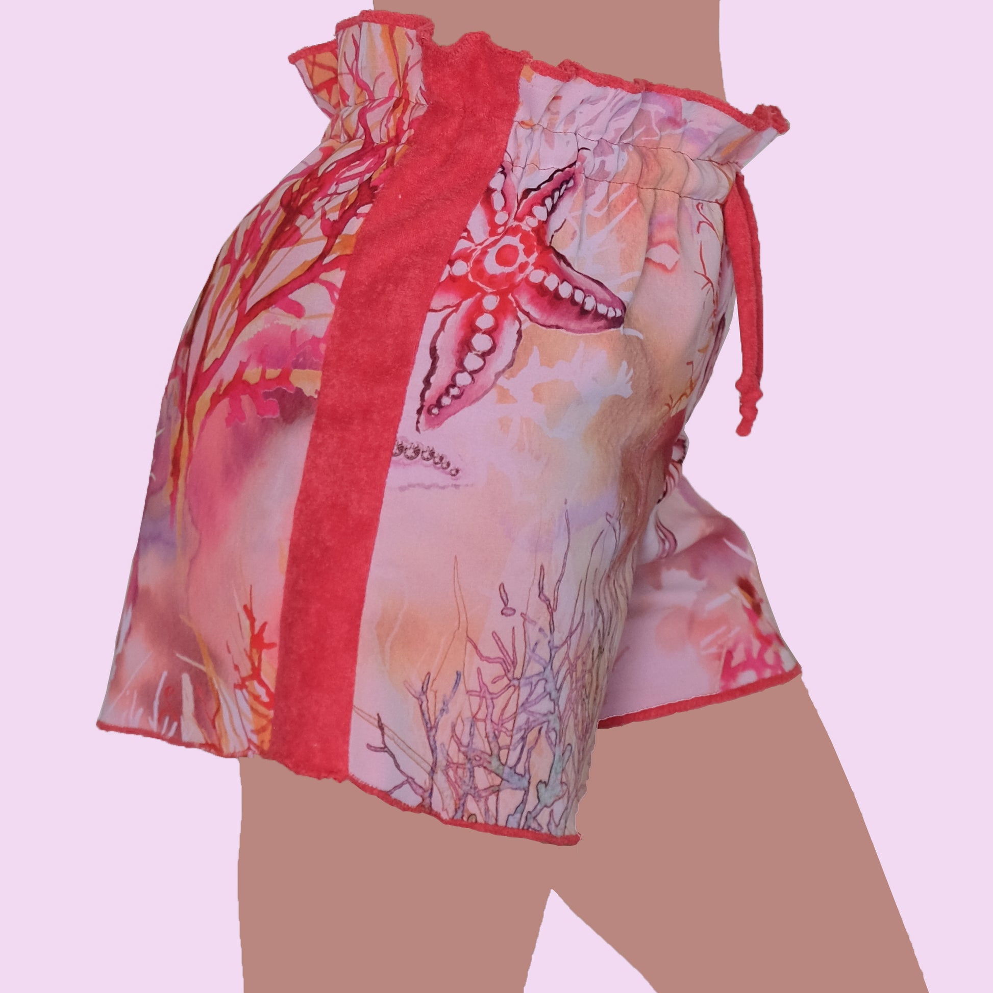 Pantaloncini conb elastico, esterno in poliestere e interno in spugna di cotone.