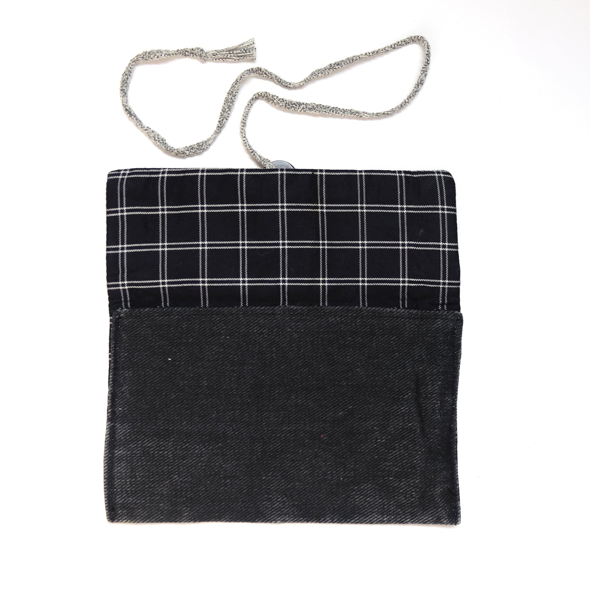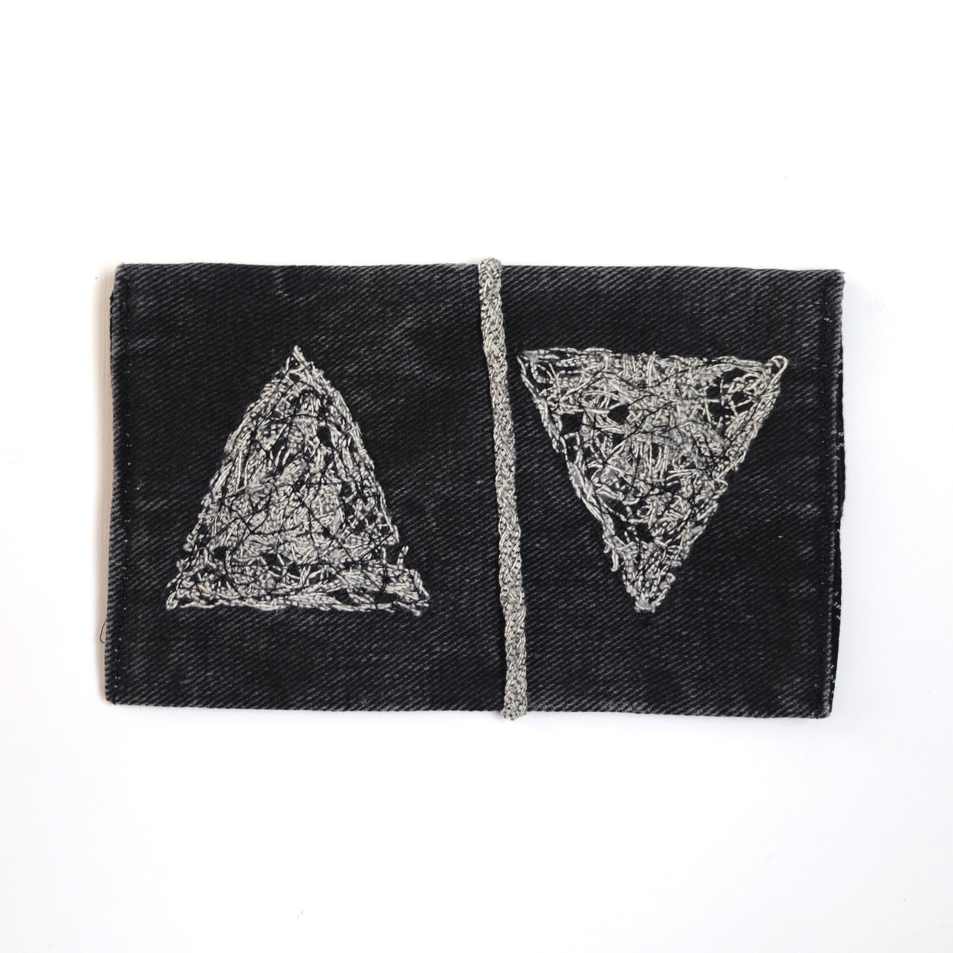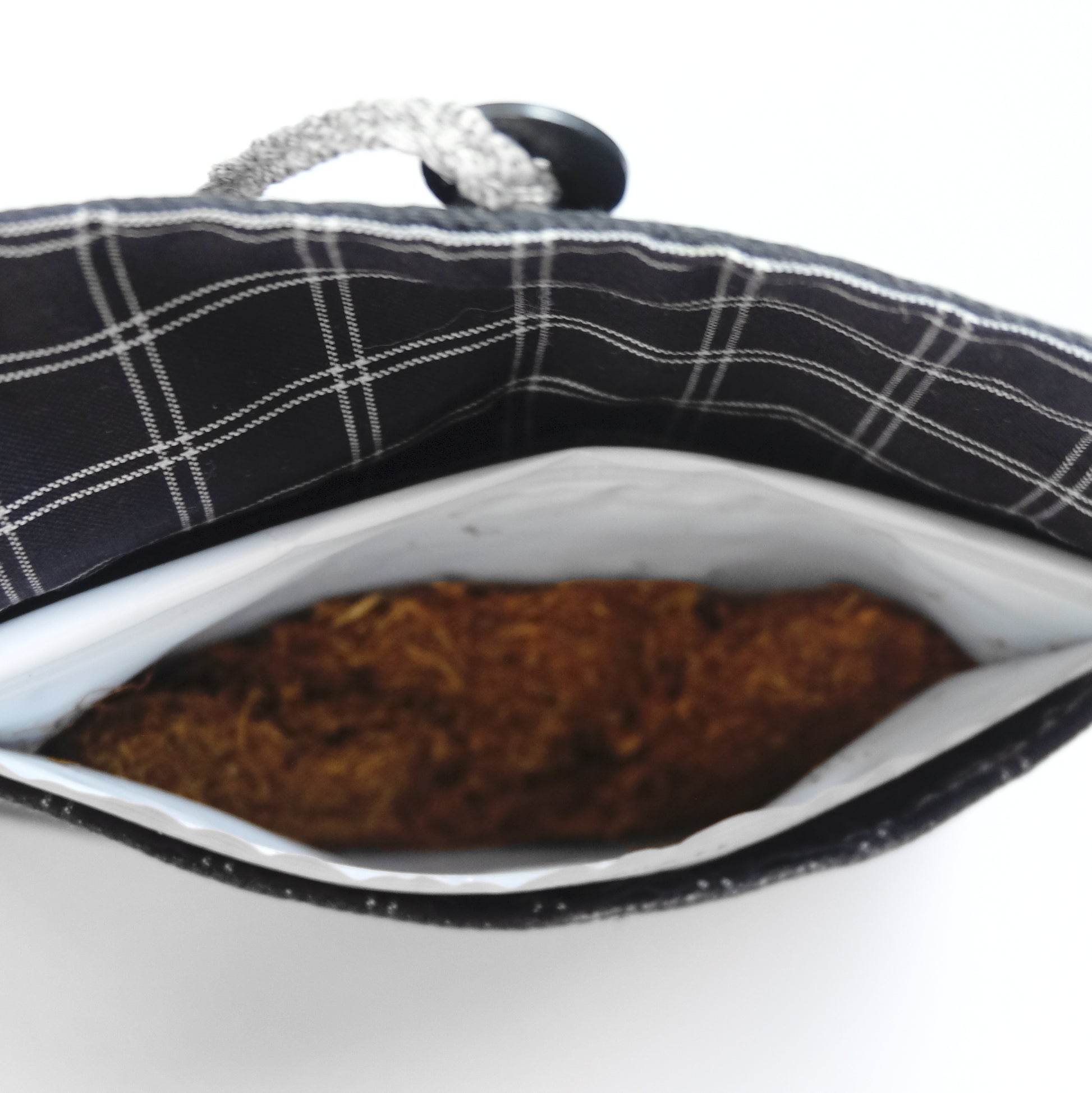 Astuccio portatabacco realizzato in denim, tela in cotone e imbottitura rivalorizzati.