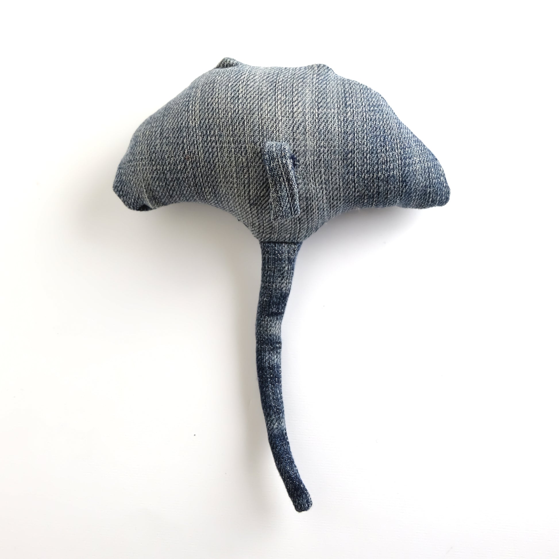 Pupazzo realizzato in denim e imbottitura sintetica rivalorizzati.