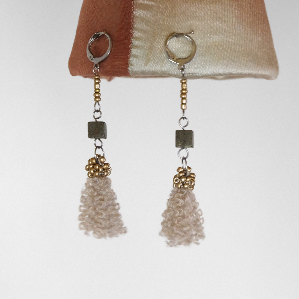 Orecchini in lana rivalorizzata, acciaio, vetro e pirite.