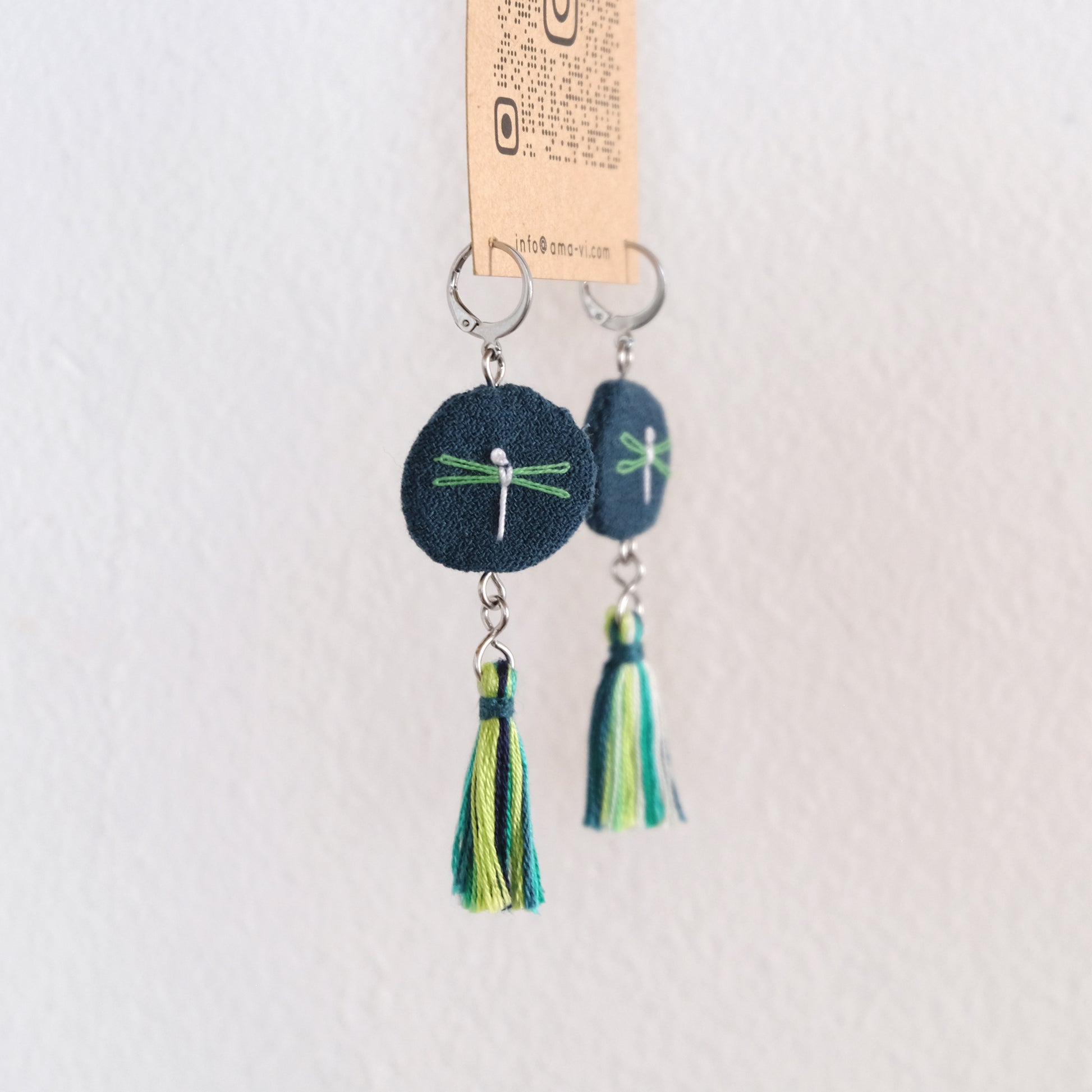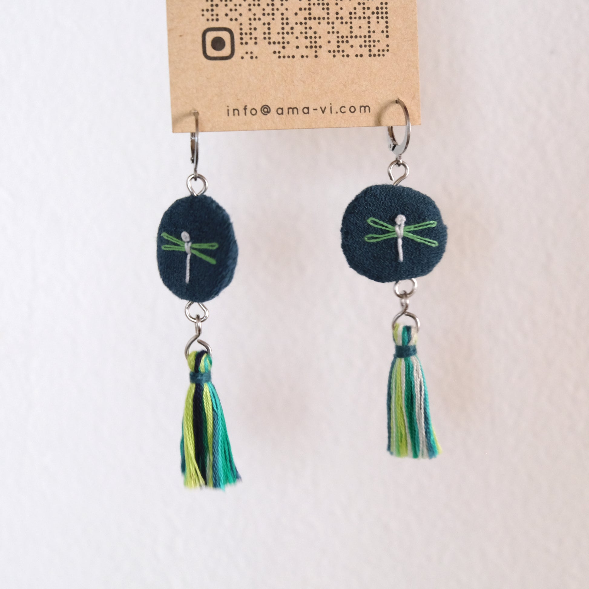 Orecchini ricamati, realizzati in poliestere rivalorizzato, cotone, acciaio.