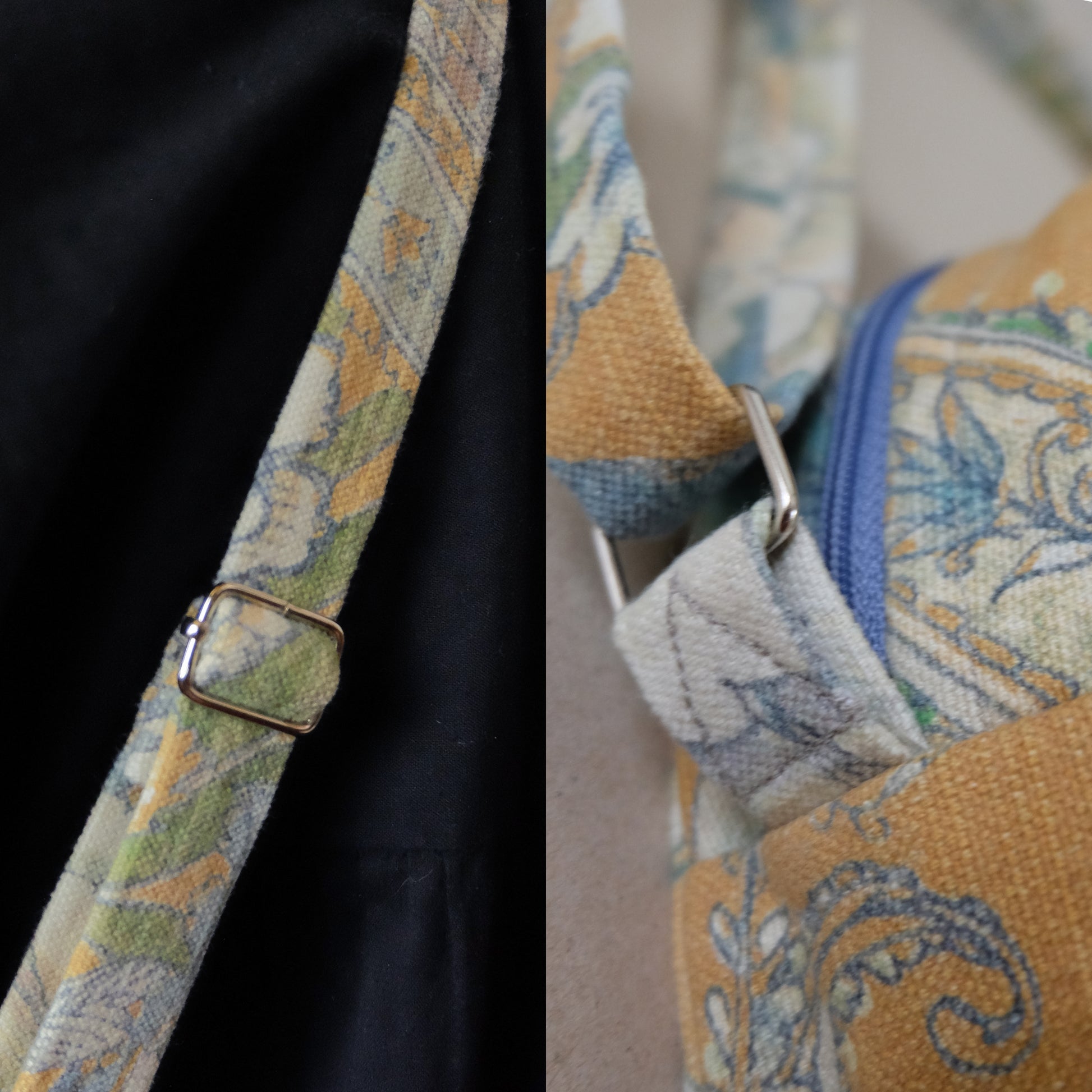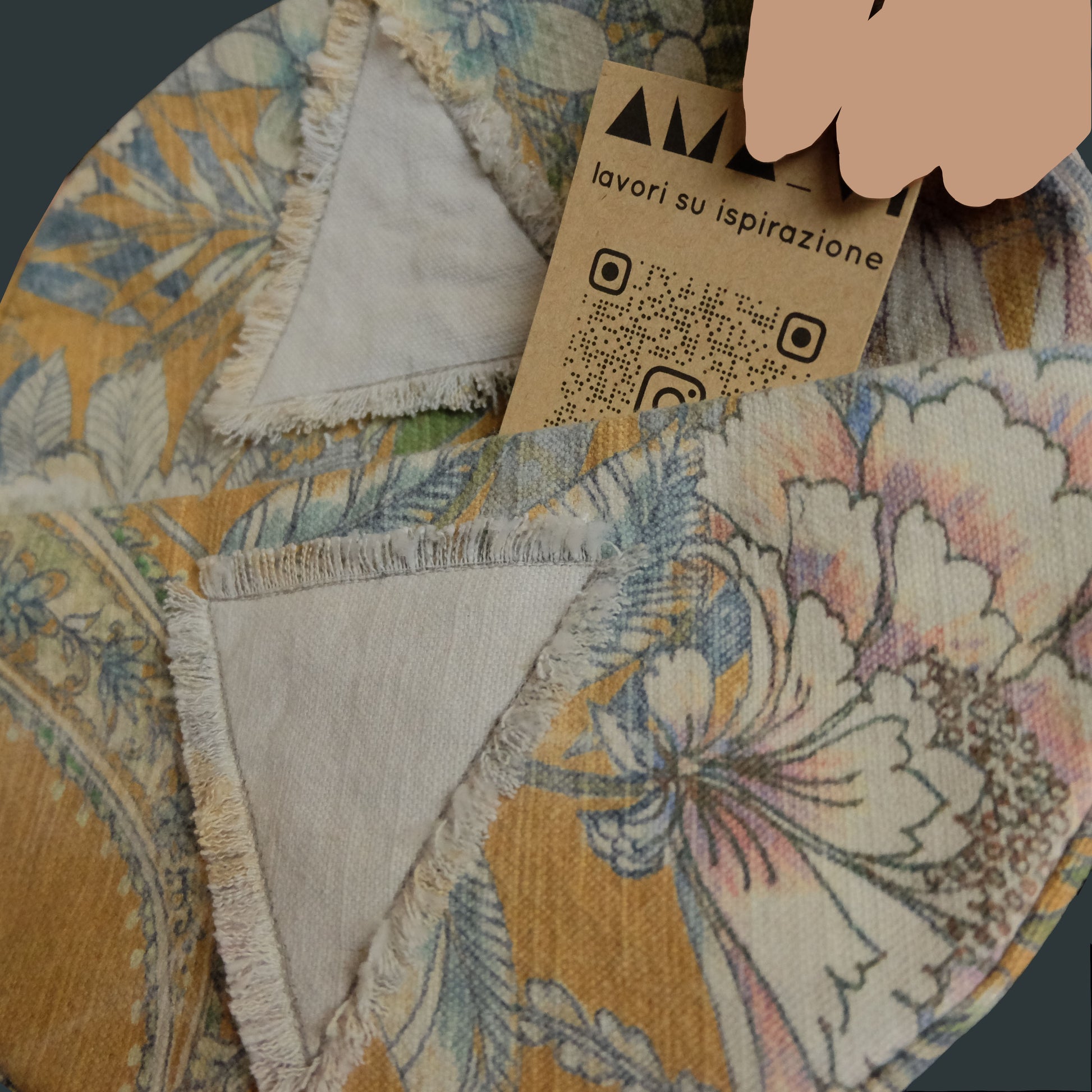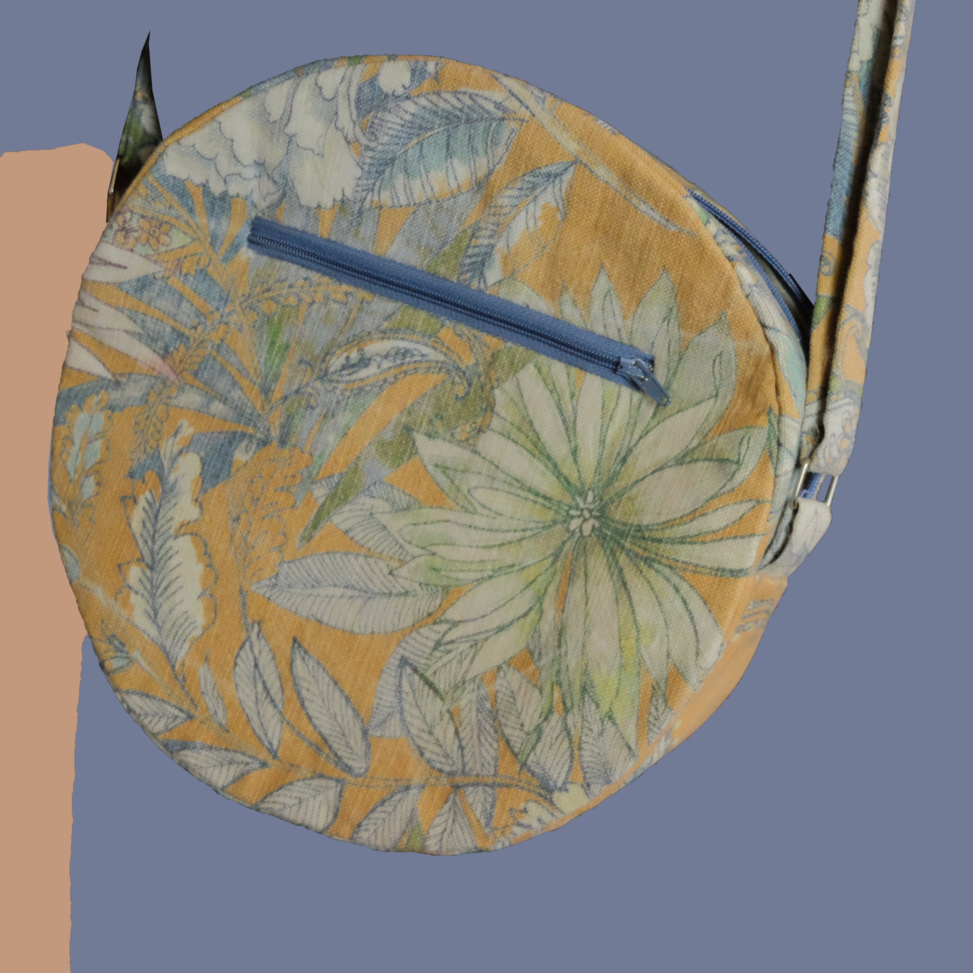 Borsa rotonda realizzata con cotone e seta rivalorizzati.