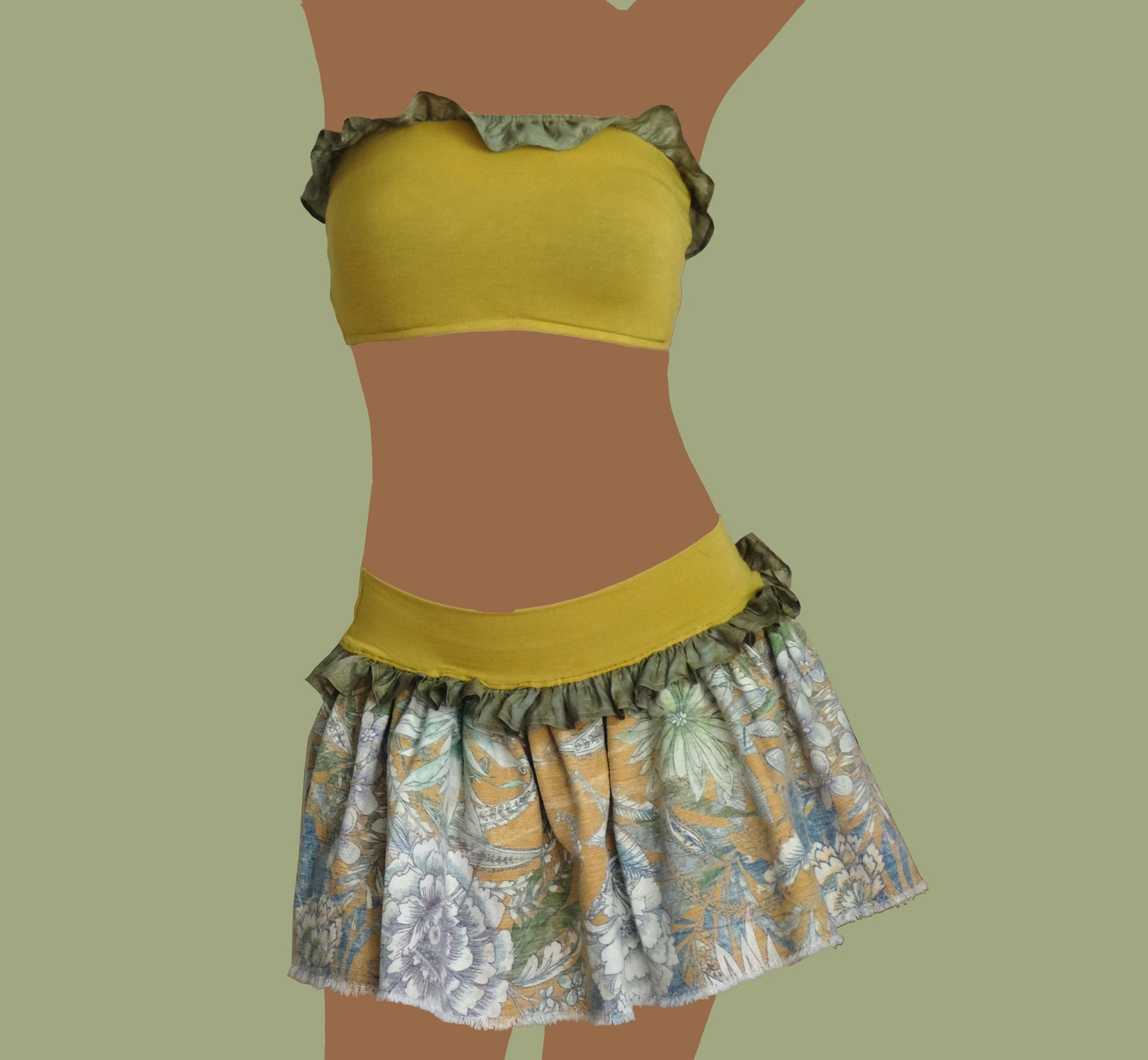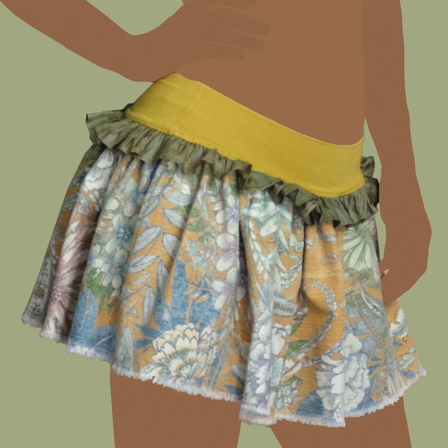 Gonna con balze realizzata con jersey di viscosa, cotone e seta rivalorizzati.