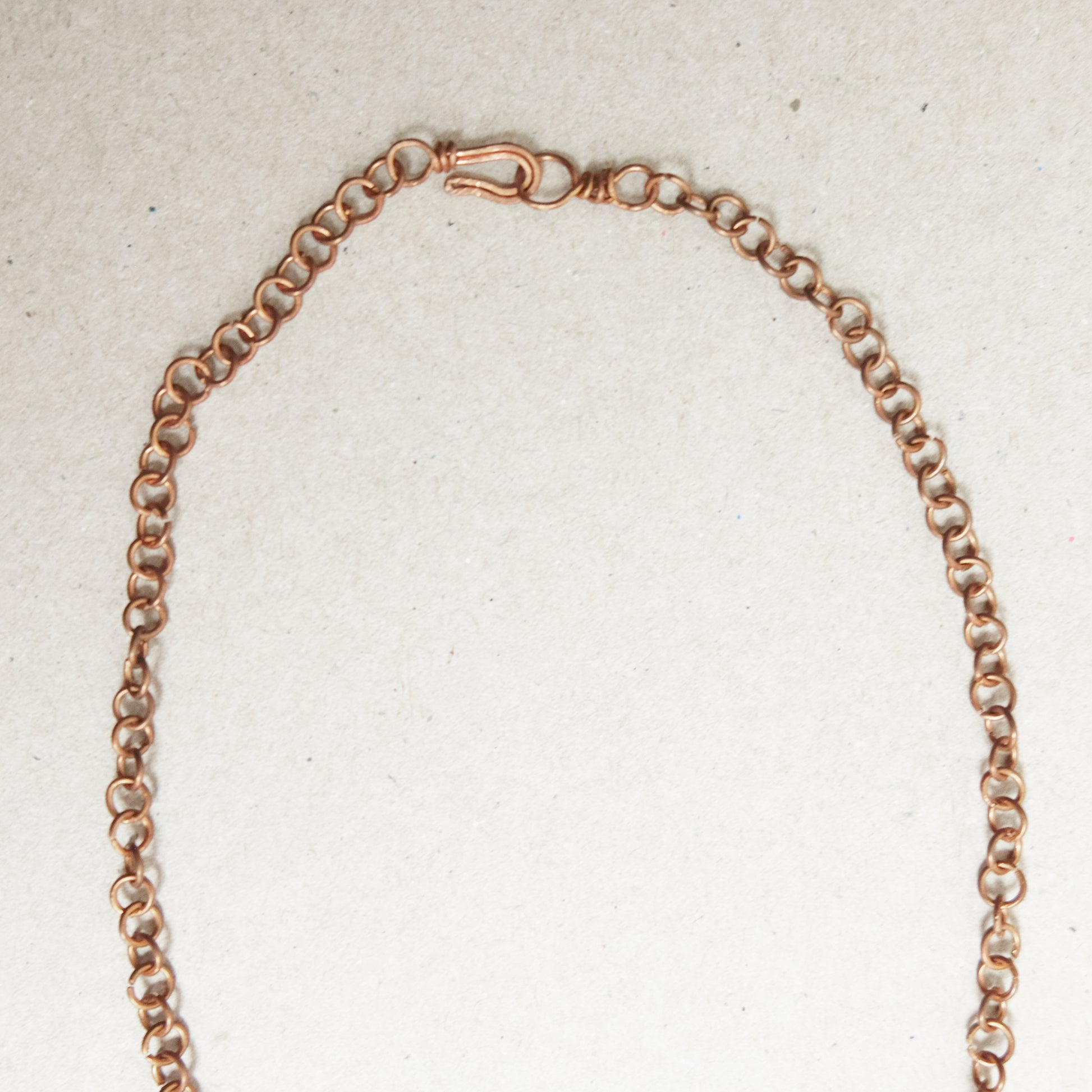 Collana realizzata con viscosa rivalorizzata, ceramica smaltata e lega in rame.