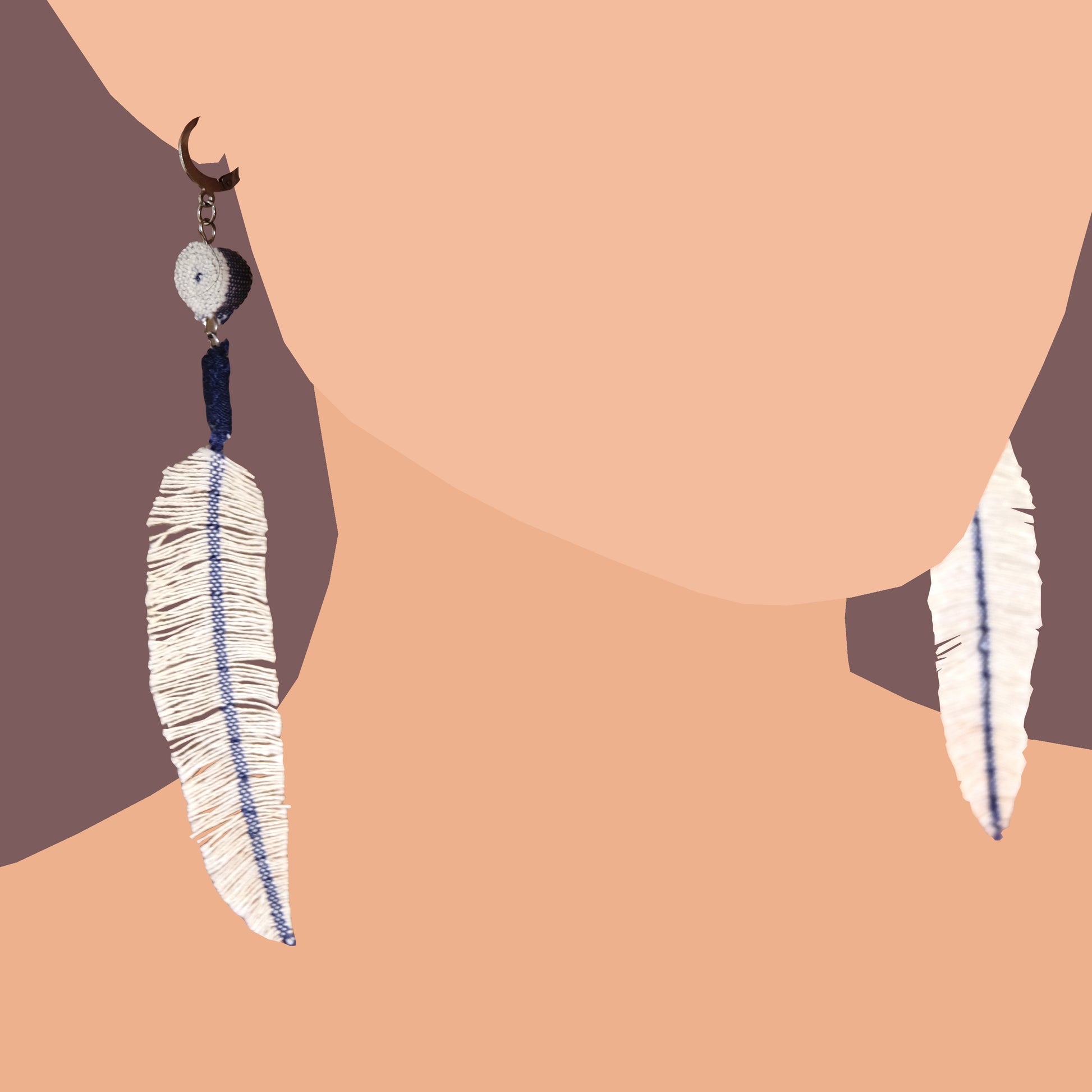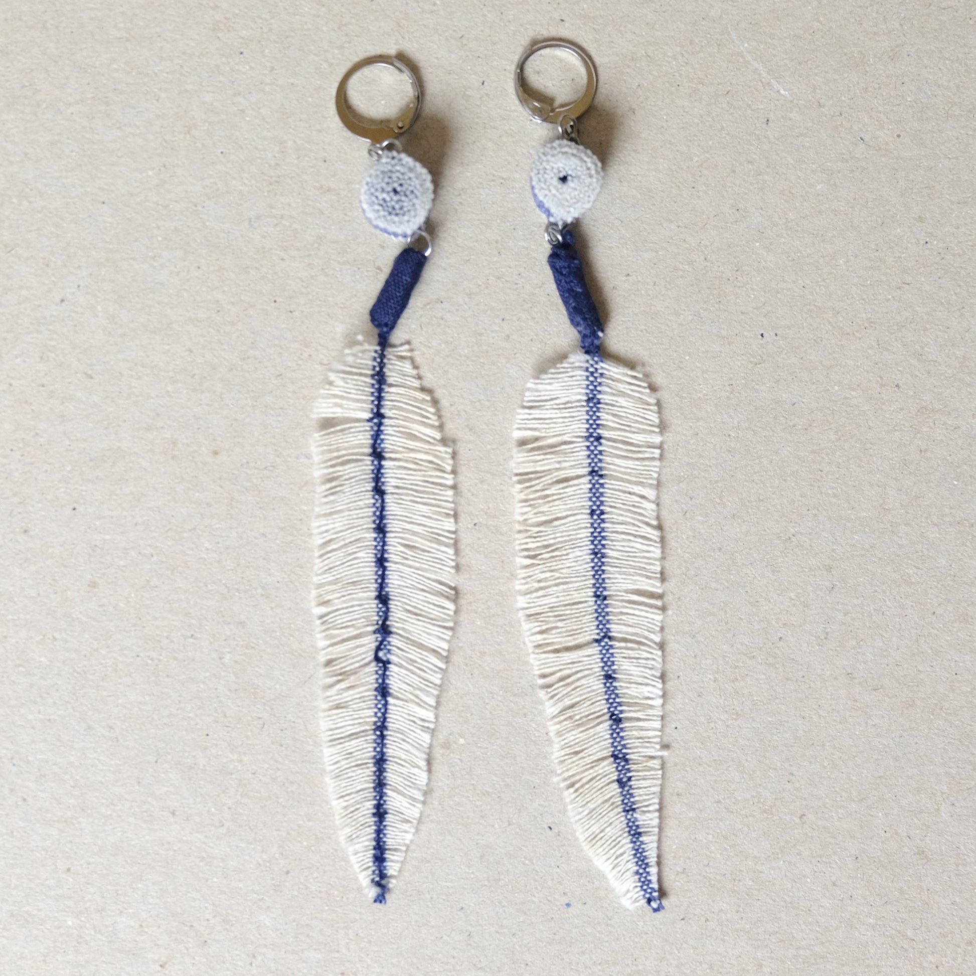 Orecchini realizzati con cotone rivalorizzato e acciaio.